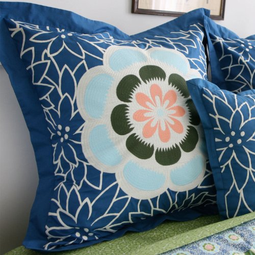Amy Butler Kyoto Embroidered European Sham brings Amy's passion for color and design to your bedroom. Cherry blossoms in bloom became the main inspiration for this rich, deep, and sensual collection. Lavish sapphire, shades of blue and white reflect the rich colors of temples, birds, and Lotus in bloom! A peaceful place to drift away. This "100% Organic Cotton" 300 thread count Kyoto European sham holds true to Amy's inspiration that bring rich textures of nature and weave them into everyday life. Amy's design and intricate embroidery gives it a warm, sophisticated feel that is at home in any décor. This is a spirited bedding collection for a passionate and happy room! European Sham Size 26" x 26".You will not be disappointed with